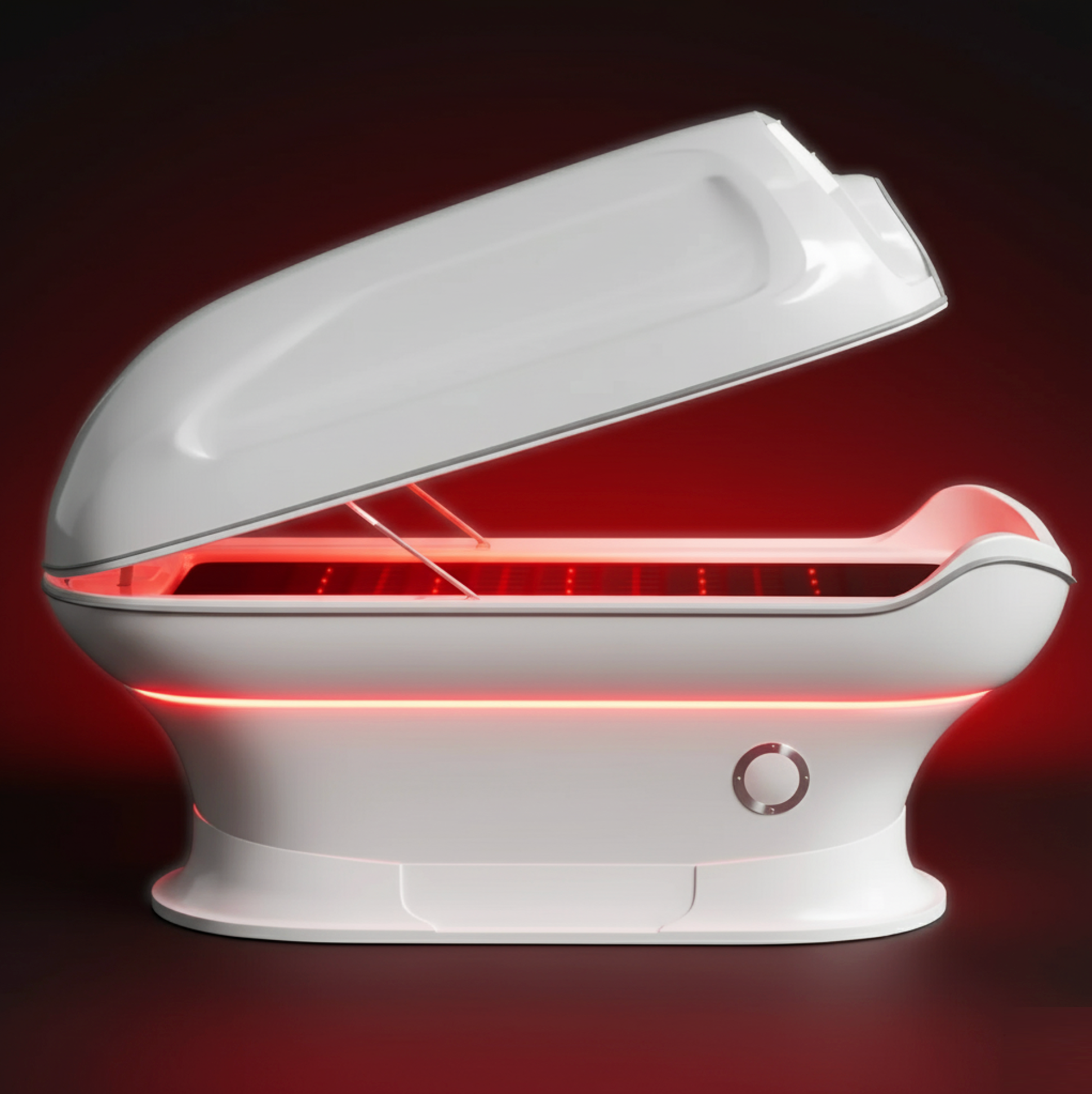 The pod is equipped with a red light panel at the end of the pod and 16 individual LED lights integrated into the PEMF mat beneath you, delivering light therapy from both above and below.